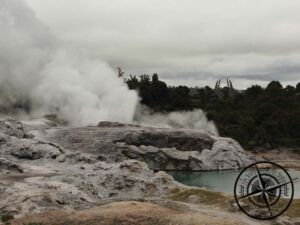 Wir sahen das „Meeting House“ genannt „Wahiao“, die heißen Quellen in denen z.B. auch die Maiskolben „gekocht“ werden und auch die bekannten „Steam Box Hangi“. Hierbei handelt es sich um Dampfkästen, wo das Essen darin durch die Hitze aus der Erde gegart wird. Außerdem kamen wir an verschiedenen heißen Quellen vorbei und sahen auch wie die Geysire ausbrechen, also Fontänen ausstoßt.