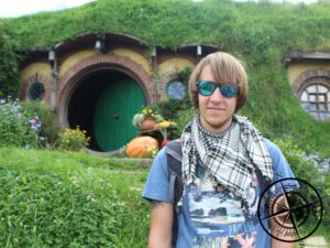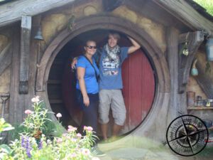 Zu Anfang bekamen wir zudem erklärt, dass lediglich eine Handvoll der „Hobbithöhlen“ begehbar sind. Die Szenen im Inneren wurden dann nachträglich im Filmstudio gedreht. Somit war ein betreten nicht möglich…aber ein Foto am Eingang schon! An einem der Hobbithöhlen hieß es in Reihe aufstellen und vom Tourguide Foto machen lassen. Das ließen wir uns natürlch auch nicht nehmen!