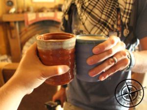 Somit ging es also über die Brücke und rein in den „Grünen Drachen“. Wir wurden dort bereits herzlich empfangen und konnten uns unser Getränk wählen. Während Vivi sich für den „Apple Sider“ entschied, wählte Torben das „Oastbarton“ und wir setzten uns in zwei bequeme Sessel vor ein Kaminfeuer. Die Inneneinrichtung ist ebenso detailreich wie bisher ganz Hobbiton. Uns blieben hier 30 Minuten zum Verweilfen, bevor es dann schon wieder zurück zum Bus ging.