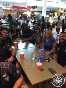 Am Flughafen waren wir (wie fast immer) gut in der Zeit. Wir holten unser Ticket ab und gaben unsere großen Rucksäcke auf. Da wir keine Info hatten, ob es was an Board zu essen gibt, sorgten wir vor und holten uns beim „Pita Pit“ jeweils eine Pita. Dort trafen wir dann auf die „New Zealand Warriors“ (Rugby Mannschaft). Auffällig in ihren einheitlichen T-Shirts mit dem Warrior-Logo stochen sie eindeutig aus der Menge heraus. Nach kurzem googeln waren wir uns nun auch hundert Prozent sicher, dass es sich um die Spieler handelt. So fragten wir höflich nach einem Bild und saßen uns zu den Jungs an den Tisch.