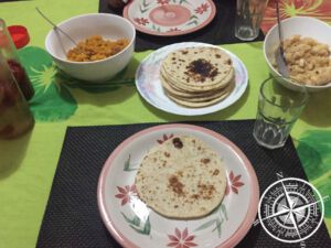 So bot sie uns auch im Vorfeld für 10FJ$ p.P. ein Abendessen an und auf Nachfrage wurde das komplette Essen auch vegetarisch gestaltet (ansonsten gibt es dazu auch oft Fisch oder Fleisch). Es gab Roti (ähnlich wie Naan Brot, aber etwas dünner und ein anderer Teig) mit Kürbismus, Kartoffelmus und (für Torben) Chili´s aus dem Garten. Es war wirklich sehr köstlich!!