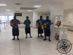 In Fidschi angekommen waren es nur ein paar wenige Wolken und als wir aus dem Flugzeug ausstiegen bekamen wir einen leichten Klimaschock, denn es war sehr schwül-warm. Bevor es zur Passkontrolle ging, wurden wir noch von 4 Einheimischen überrascht, die die Fluggäste mit Musik empfangen! Nach Passkontrolle, Gepäckabholung und weiterer Checks ging es zur üblichen Routine. Sim-Karte kaufen, Geld abholen (Umtauschen mussten wir diesmal nichts) und ab zum Transport zur Unterkunft.