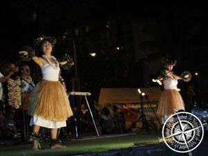 Vier Musiker und viele Tänzer zeigten zu verschiedenen Liedern den „Hula“- Tanz. Viele Bewegungen haben wir wiedererkannt, die Vivi am Vormittag gelernt hatte. Die Musik war gut, aber der Gesang etwas schrill (zu viel hohe Töne). Zuerst gab es etwas mehr modernen Hula und es wurde viel über die einzelnen Lieder und deren Bedeutung erklärt. Im weiteren Verlauf gab es dann auch einen Einblick in die Geschichte und so gab es Hula aus ursprünglicher Zeit mit wenig Begleitung von Instrumenten und dafür auch die klassische Kleidung mit grünen Kränzen und Bastrock.
