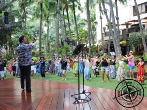Jeden Dienstag, Donnerstag und Samstag findet am „Kuhio Beach“ von 18:30 bis 19:30 Uhr eine Perfomance-Show vom „Hawai´i´s finest hula hálau“. Als wir dort ankamen, war die ganze Rasenfläche vor der Bühne schon voll und wir suchten uns noch ein Plätzchen in der Menge.