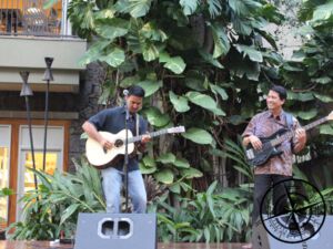 Ab sechs Uhr gab es dann in der „Royal Grove“ (also im „Royal Hawaiian Centre“ ein „Hawaiian Entertainment“. Letztendlich waren dann zwei Männer auf der Bühne, die mit Gitarre und Bass hawaiianische Musik gemacht haben. Es klang wirklich sehr gut und die gesamte Atmosphäre war sehr angenehm und relaxt, aber nicht ganz das, was wir uns erhofft hatten.