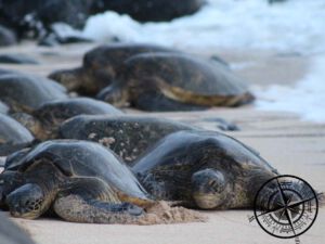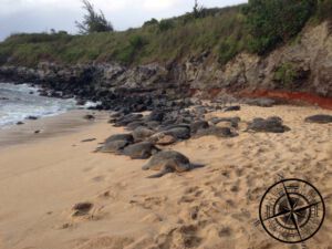 Als wir dort ankamen waren schon sehr viele Hono am hinteren Bereich des Strandes und wir staunten nicht schlecht. Gegen Abend wurden es immer mehr und am Ende lagen dort 107 Schildkröten, die sich dort für die Nacht zum Schlafen einen Platz gesucht hatten. Unglaublich – 107 Schildkröten! So viele hatten wir nicht erwartet und auch Ian meinte, dass es schon lange nicht mehr so viele waren, oftmals sind es 30-40 im Durchschnitt.