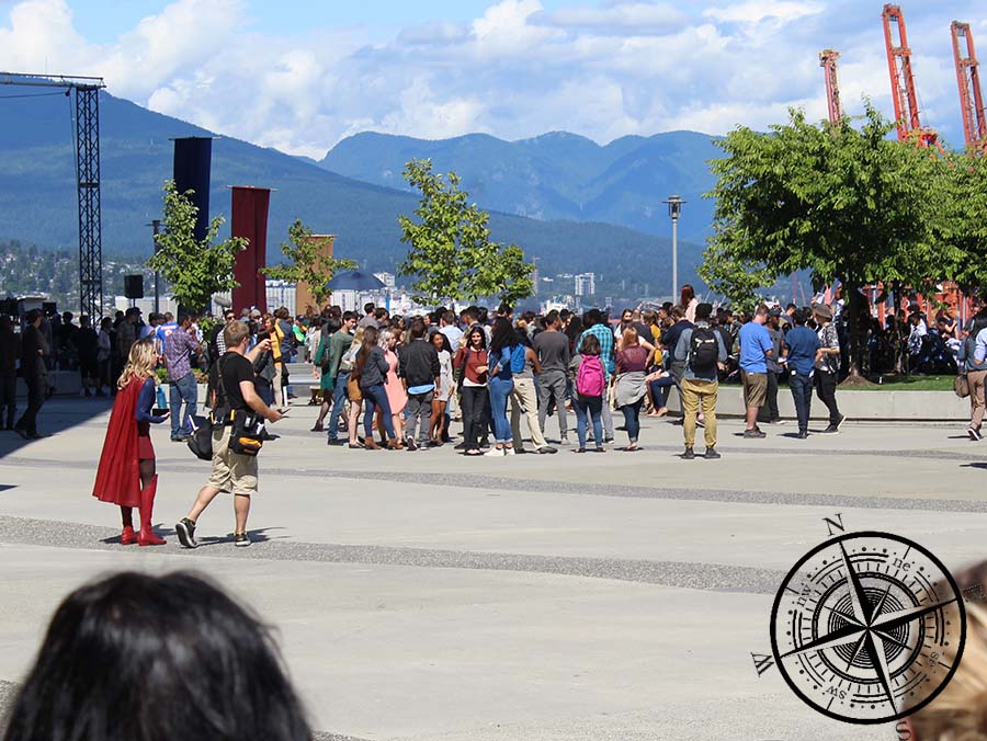 Irgendwann kam aber nichts mehr, sodass wir wieder umdrehten und dann der „Granville Street“ quer durch Downtown in Richtung „Waterfront“ folgten. Wir wollten von einer Erhöhung einen Blick auf das Wasser und die Berge haben, doch an einer Absperrung kamen wir nicht weiter. Security hielt „Wache“ an der Absperrung und einige Mitarbeiter wuselten umher. Ein paar Meter weiter entfernt sahen wir viele Menschen und dann kam plötzlich eine Durchsagen gefolgt von „…and Action!“. So waren wir nun mitten am Filmset und durch ein paar Stühle am Rand (wie man die so aus den typischen Filmsets kennt) wurde ersichtlich, dass hier gerade für die dritte Staffel der Serie „Supergirl“ gedreht wird. Es gab hier viele Kompasenrollen und wieder und wieder wurde eine Szene gedreht, dass etwas explodiert und alle wild (und leicht kreischend) durch die Gegend rennen. 😀 Interessant anzusehen und hin und wieder erblickten wir auch die Hauptschauspielerin – „Supergirl“.