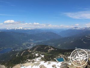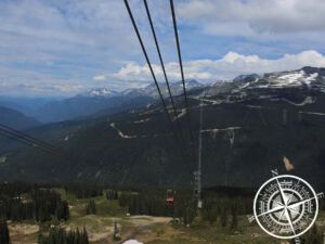 Die erste Gondelfahrt ging schon steil hinauf. Es ist eine geschlossene Gondelkabine für circa 4-6 Personen und die Aussicht ist traumhaft. Man kann Glück haben und Schwarzbären unten im Wald entdecken, was wir aber nicht hatten. Stadttdessen konnten wir nur immer mal einen Mountainbiker sehen, die die Abhänge runter gefahren sind. Sieht nach Spaß aus, aber hat auch seinen Preis! Der untere Abschnitt des „Whistler Mountain“ ist bereits wunderschön. Realtiv viel Schnee gab es noch, Kanadaflaggen wehen im Wind, die Sonne scheint und man hat einen unglaublichen Blick auf „Whistler Village“ und die komplette Umgebung. Es war wirklich richtig schön! 🙂