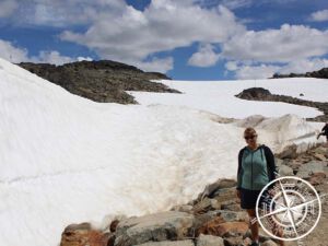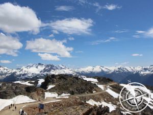 Natürlich wollten wir auch komplett hoch auf den „Whistler Mountain“ und so fuhren wir mit der offenen Gondel hinauf. Dort ist man dann beim „Top of the World Summit“ und somit auf 2182m Höhe. Dort oben gefiel es uns am Besten, denn die Aussicht war einfach traumhaft. Ein bisschen WInterurlaubfeeling hatte es zwar, aber trotz das wir keine Wintertypen sind, gefiel es uns richtig gut! 🙂 Dort oben hat man nicht nur eine tolle Aussicht, sondern hier befindet sich auch eine großes „Inukshuk“ und ein Foto vor dem großen Steingebilde durfte natürlich auch nicht fehlen. Nachdem wir viele Fotos dort gemacht haben, entschieden wir uns einen leichten und kurzen Wanderweg zu machen. Leider haben wir erst zu spät gesehen, dass der „Whistler Summit Interpretive Walk“ zur Hälfte gesperrt ist und so mussten wir eben umdrehen. Aber das machte nichts, denn das Wetter war super und die scheinbar Null Grad hier oben fühlten sich eher nach 15 an. 😀
