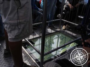 Danach fuhren wir wieder mit der Gondel nach unten, um von dem unteren Teil des „Whistler Mountain“ mit der großen Gondel („Peak to Peak“) zu einem anderen Berg zu gelangen. Hier hat man die Qual der Wahl, ob man mit einer normalen Gondel oder mit einer „Glasbottom“ Gondel fahren will. Wir nahmen die 30 Minuten warten auf uns, um mit einer „Glasbottom“-Gondelkabine zu fahren. Leider war die Vorfreude größer und beim Betreten der Gondel waren wir etwas enttäuscht. „Glasbottom“ heißt hier nämlich ein Fenster mitten in der Kabine, welches bin einem Geländer drum herum abgesichert ist. Viel kann man auch nicht sehen, außer die Tannenbäume.. Daher nicht sonderlich lohnenswert.