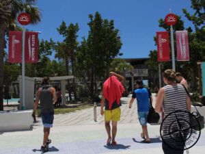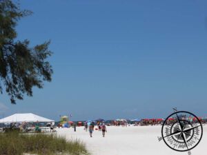 Und zwar gibt es hier auf Siesta Key den „Siesta Beach“, welcher als #1 Strand der USA zählt. Der zugehörige Parkplatz war noch nicht voll und kostenfrei. Somit stellten wir hier unser Auto ab und schlenderten mit Handtüchern und Trinken zum Strand.