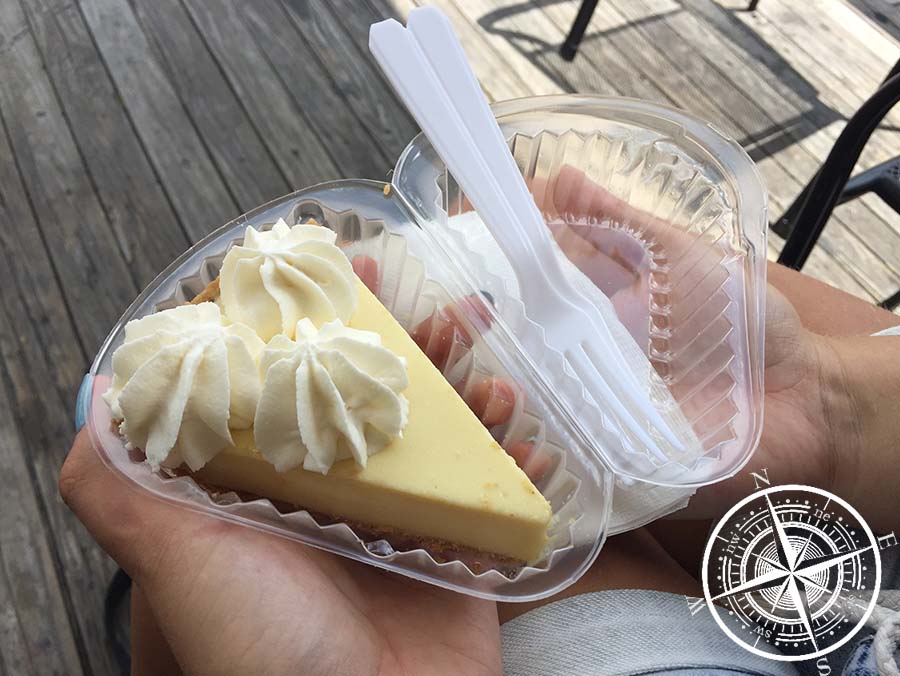 Von dort gingen wir die „Duval Street“ entlang, welche für Key West bekannt ist, denn hier befinden sich die meisten Shops, Bars und Restaurants. Hier hielten wir Ausschau nach Essen und vor allem nach einem „Key Lime Pie“. Dieser Kuchen ist bekannt für die Keys und wird aus den Limetten, die auf den Keys wachsen, zubereitet. Die Konsistenz erinnert an einen Käsekuchen, aber ist durch die Limette recht säuerlich, aber trotzdem sehr lecker! Nachdem wir fündig wurden und das Dessert vor dem richtigen Essen genossen, ging es die „Duval Street“ weiter entlang. Allgemein war in Key West nicht viel los, manche Geschäfte hatten geschlossen und ansonsten waren die Leute eher mit Vorbereitungen zugange. Denn der Hurricane wird auf jeden Fall Auswirkungen auf die Keys haben und so wurden Fenster und Türen mit großen Spanlatten versiegelt. Man hörte die Leute sich gegenseitig fragen, ob sie auf der Insel bleiben oder gehen. Erschreckend! :O