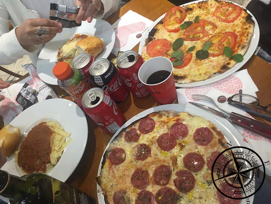 Zum Abend lernten wir dann noch Carla kennen, die Freundin von Luiz. Er hatte bereits gestern gefragt, ob wir dann am Abend alle zusammen etwas Essen gehen wollten, wo wir gerne zusagten. In dem nahegelegenen Supermarkt befindet sich im hinteren Teil ein Restaurant, welches laut Luiz sehr gute Pizza- und Pasta-Gerichte serviert. Somit ging es für uns dort hin und wir beide bestellten uns je eine Pizza, während Luiz und Carla Nudeln mit Bolognese bevorzugten. Es kamen dann zufällig noch ein paar Freunde von ihnen vorbei und wir erweiterten unseren Tisch um einen weiteren. Wir versuchten den Gesprächen zu lauschen und Luiz übersetzte Teile für uns. Es war ein toller Tag, der mit einen gemeinsamen Abend beendet wurde! Hinweis: