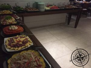 Es machte uns irgendwie stutzig, aber auch gespannt. In dem Essensaal, wo sonst immer das Frühstück stattfindet war alles eingedeckt und ein großes Buffet aufgetischt. Na, da sagt man doch nicht Nein. Es gab wieder eine große Auswahl an verschiedenen Speisen und wir wurden mehr als satt. 😀 Ein gelungener letzter Abend! 🙂