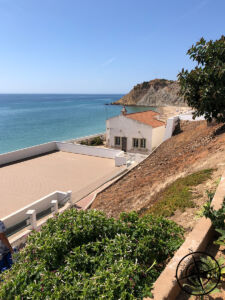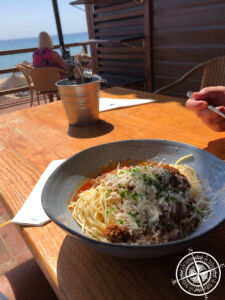 Wir schlenderten die Straße hinunter und nahmen dabei einen weiteren VLOG auf. Vorbei an einem Souvenirladen kamen wir dann zu einem Vorplatz, von wo aus man schon den Strand sehen konnte. Die Bucht war rechts und links von den Klippen geschützt und als wir über eine Treppe hinunter sahen, sahen wir warum wir zuerst keinen Parkplatz gefunden hatten. Der überschaubare Strand schien beliebt und war voll mit allerlei Menschen. Wenn man dem schmalen Weg am Strand lang folgt, gelangt man zur „Beach Bar Burgau“. Auch das Restaurant war zur Mittagszeit gut besucht. Beim betreten fragten wir dennoch nach einem Platz für 2 und bekamen einen der Restlichen. Der war wohl nicht so beliebt, da er direkt in der Sonne war. Für Patrick rückten wir alles ein Stück in den Schatten und ich genoss die warmen Sonnenstrahlen auf dem Sonnenplatz.