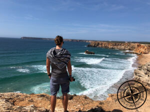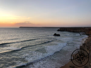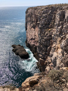 In Sagres angekommen, stand als Erstes das Südkap auf dem Plan. Dafür parkten wir auf einem großzügigen, riesigen und kostenfreien Parkplatz kurz vorm „Fortaleza de Sagres“. Von hier aus gingen wir zunächst zur Steilküste und schauten zum Weststrand hinunter. Da stand direkt fest, dass wir dort später noch in die Wellen springen wollten. Ein paar Fotos und Videos später gingen wir dann zum Eingang des „Fortaleza de Sagres“ und zahlten Eintritt. Der Preis für einen Erwachsenen beläuft sich auf 3,00 € und Patrick kam als Student für sogar nur 1,50 € rein. Der Eintritt ist notwendig, wenn man wirklich am Südkap von Portugal stehen will und bei den Preisen nun wirklich auch kein Hinderniss. Zudem wird das Geld zur Erhaltung des Denkmals und geländes investiert.