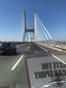 Währenddessen kam der zweite Polizist hinzu und folgte dem Gespräch. Es würden wohl aktuelle Zulassungsdokumente fehlen. In der Mappe waren allerhand Zettel, doch dabei handelte es sich um die alten Zulassungen von unseren Vormietern. Diese seien überhaupt nicht mehr relevant meinte der Polizist. Nach etwas längerer Suche fanden wir darunter dann aber auch die richtigen Dokumente für unseren Mietzeitraum. Alles war gut und es hieß dann, dass wir weiterfahren dürfen. Der Polizist fragte dann noch, welche Strecke wir nach Lissabon einschlagen wollen und empfiehlte uns auf jeden Fall die Brücke „Ponte Vasco da Gama“ mitzunehmen, auch wenn es kostenpflichtig ist. Sofern man aber keine Maut zahlen will, kann man auch nur für die Brücke zahlen was immer noch überschaubar günstig sein soll. Dann zeigten wir ihm noch etwas das Innenleben des Campers, denn auch dazu waren beide Polizisten sehr interessiert. Sie hätten wohl gerne mit uns getauscht. 😉