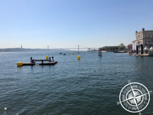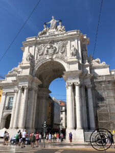 Nach nur 6 Minuten Wartezeit wurden wir bereits am Campingplatz Eingang abgeholt und für 13,94 € in die Innenstadt bzw. zum „Praça do Comércio“ gefahren. Wie wir fanden ein definitv annehmbarer Preis. Von hier sollte dann unsere Stadttour losgehen. Da wir einige Meter vor Ziel in einen Stau gerieten, lies uns unserer Fahrer auf Nachfrage einfach am Gehweg raus. Wir hielten unsere Ankunft kurz mit der GoPro fest und gingen dann los. Hier war wohl aktuell eine Art Triathlon aktiv, denn wir konnten am Hafen einige Zelte, Veranstaltungsflyer und Sportler sehen. Dies interessierte uns aber nur kurz und es ging dann für uns über den „Praça do Comércio“ zum „Arco da Rua Augusta„. Dies ist der prachtvolle Triumphbogen, welcher vom Hafen aus den Zugang zur Innenstadt darstellt.