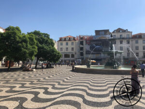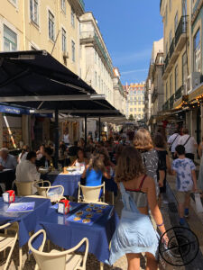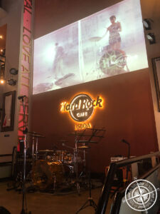 Da wir bisher noch nichts gegessen hatten, wurde auch dies allerhöchste Zeit. Wir schlenderten die „Rua Augusta“ weiter gen Norden bis wir zum „Praca Rossio“ kamen, einem der bekanntesten Parks/Plätze in der Innenstadt. Neben einem Springbrunnen und Statue war der Boden mit lauter Mosaikfliesen verziert. Inzwischen hatten wir uns auch schon für eine Essenslokation entschieden, auch wenn dies nicht gerade portugiesisch sondern eher rein touristisch ist. Da Patrick aber auch noch nie in einem Hard Rock Cafe war, verschlug es uns dorthin. Das lag nur einige Minuten weiter nördlich vor der „Av. da Liberdade“. Hier langten wir ordentlich zu und stärkten uns erst einmal.