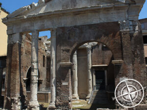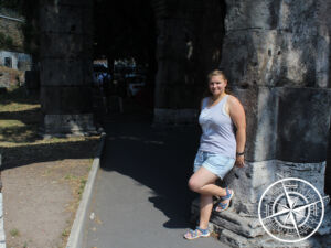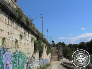Wir kamen zum Fluss „Tiber“, welcher durch Rom strömt. Das Feeling erinnerte uns etwas an Marburg, als wir dort am Fluss entlang liefen. Der Weg ist ganz schön, da er auch etwas abgelegen ist und man hier und da mal ein paar nette Fotos machen kann, wie z.B. von der katholischen Kirche „Santa Maria del Priiorato“ oder den Blumen, die an der Mauer wachsen. Aktuell finden hier an der Tiber ein paar Veranstaltungen statt und überall gab es kleine Zelte, Bars, Bühnen und verschiedene Essensangebote. Doch mitten am Tag war hier grad nichts los. Daher setzten wir unseren Weg fort und überquerten die „Ponte Cestio“ in Richtung Innenstadt von Rom. Vorbei an den ersten historischen Monumenten (Portico d´Ottavia) und ausgeschilderten Ruinen, bahnten wir unseren Weg durch die schmalen Gassen Roms.