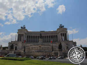 Kaum erreichten wir das Ende einer schmalen Gasse, befanden wir uns auf einem riesigen Vorplatz mit Blick auf das „Viktor-Emanuelsdenkmal“ auf dem „Piazza Venezia“. Ein wirklich mächtiges Gebäude mit beeindruckendem Anblick mitten in Rom. Wir suchten einen Übergang über die viel befahrene Straße, als plötzlich die Polizei den Verkehr anhielt und wartete. Dann kamen mehrere schwarze Limousinen und Vans aus einer Straße angefahren und wurden von der Polizei begleitet. Hier schien es sich wohl um jemand wichtigen gehandelt zu haben. Wir setzten unseren Weg fort und entschieden uns erst einen Blick von vorne auf das Gebäude zu bekommen. Auf einem kleinen Grünplatz auf dem „Piazza Venezia“ hatte man den perfekten Fotostop dafür, weshalb wir auch nicht die Einzigsten waren.