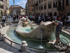 Ein weiteres Ziel hatten wir noch vor der Rückkehr und dies waren die spanischen Treppen am „Piazza di Spagna“. Somit schlenderten wir ein wenig durch den Park auf der „Terazza del Pinico“, bevor uns der Weg wieder hinunter in die Gassen Roms führte. Es dauerte nicht lange, bis wir den entsprechenden Vorplatz erreichten, welcher ebenfalls aufgrund der Menschenansammlung leicht erkennbar war. Die um ca. 1723-1726 erbaute Treppe war ebenfalls imposant und mit seiner Vielzahl an Stufen nicht übersehbar. Am Vorplatz befand sich noch ein Brunnen, an dem man seine Trinkflasche auffüllen konnte. Die Chance ließen wir uns nicht entgehen! Auch hier liefen Mitarbeiter herum, die Unwissende darauf aufmerksam machten nicht auf den Treppen zu sitzen oder auf den Geländer und anderen Bereichen lang zu gehen. Falls man es jedoch doch tat, wurde man mit einer Trillerpfeife angepfiffen und durch Worte und Gestik darauf aufmerksam gemacht es zu unterlassen.