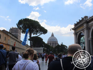 Wir fanden uns zeitig am Treffpunkt ein und warteten die letzten Minuten im klimatisierten Aufenthaltsraum für die Vatikan Tour. Dann kam unser Guide „Teresa“, welche hervorragend Deutsch sprach. Sie ist Italienerin, war aber auf einer Schweizer Schule und konnte daher Deutsch und arbeitete seit einiger Zeit als Guide für Touren im Vatikan. Unsere Gruppe war zwar mit 37 deutlich größer als 25, doch wollten wir nicht voreilig Kritik üben. Gemeinsam ging es dann zum Eingang des Vatikans für Touren und Einzelpersonen. Auf dem bekannten Petersplatz befindet sich aktuell lediglich der Ausgang. Nach einer kurzen Sicherheitskontrolle am Eingang (ähnlich wie am Flughafen) warteten wir, bis Teresa unsere Tickets organisiert hatte. Dann ging es eine Etage höher, wo wir unsere Empfänger und Kopfhörer erhielten.