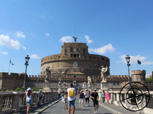 Nun waren wir knapp über 3 Stunden unterwegs und hatten Hunger. Wir folgten zunächst der „Via della Conciliazione“, welche gerade aus dem Petersplatz hinausführt. Am Ende gelangt man zur „Engelsburg“, einer runden Burg aus dem 2. Jahrhundert mit Möbel- & Gemäldesammlungen in Renaissancegemächern. Hier hatten wir uns vorab informiert und auch die Sehenswürdigkeiten im Inneren recherchiert, aber nichts komplett überzeugendes gefunden, weshalb wir es bei einem Außenanblick belassen wollten. Der Eintritt war zwar mit unter 10€ überschaubar, doch man muss ja nicht alles mitnehmen, wenn es einen nicht anspricht. Viel mehr bestaunten wir die Burg von außen und machten fleißig Fotos.