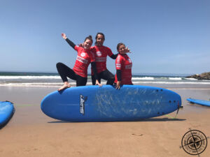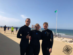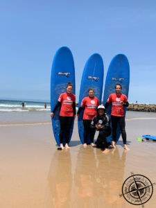 Die Zeit ging dann teilweise schneller um als erwartet und nach der letzten Runde im Wasser trafen wir uns wieder am Strand. Hier war es Rui nochmal wichtig jedem einzeln zu erklären was gut lief und wo er am meisten Verbesserungspotenzial sieht. Inzwischen waren wir auch alle etwas erschöpft von den ungewohnten Bewegungen und somit lässt auch die Konzentration nach. Daher hatte Rui die Zeit von 2 Stunden bewusst so für seinen Surfkurs angesetzt. Es folgte noch die Fotosession, bevor wir uns dann mit den Surfboard auf den Rückweg zur Surfschule machten. Einmal kurz abduschen, umziehen und bereit für die Abfahrt machen. Hierbei fragte Rui uns, was wir von seinem Kurs halten oder er verbessern könnte. Kurz überlegt fiel uns nichts ein, was wir vermisst hatten. Er ist ein sehr fürsorglicher Surf Instructor, der Wert auf die bestmögliche Mischung von Lerninhalt und Spaß legt. Er lud uns hinterher sogar noch auf einen Kaffee bei einem Coffee Shop in der Nähe seiner Schule ein, wo wir uns noch etwas unterhalten konnten.