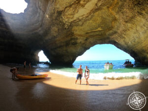 Wir fuhren knapp 2 1/2 Stunden gen Süden bis zu unserem ersten Ziel des Roadtrip. Der Strand „Praia de Benagil“ oder um etwas genauer zu sein die dort vorhandene Höhle. Der Zugang zum inneren der Höhle befindet sich im Wasser und man muss daher vom benachbarten Strand aus dort hinschwimmen. Wir kamen um ca. 09:30 Uhr am dortigen Parkplatz an und es war noch relativ wenig los. Torben wusste aber bereits, dass sich das schnell ändern wird. In Badesachen und nur der GoPro im „Gepäck“ machten wir uns auf den Weg zum Strand. Wir hatten alles im Auto gelassen und dann am Türgriff unseren Keysafe befestigt, wo sich der Autoschlüssel drinnen befand. Da wir etwas hinaus schwimmen um zur Höhle zu gelangen und kein Waterbag dabei hatten, wollten wir unsere Sachen nicht unbeaufsichtigt am Strand liegen lassen.