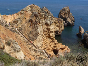 Der nächste Halt unseres Roadtrip war „Ponta da Piedade“ und lag nun 40 Minuten mit dem Auto entfernt. Dieser Ort befindet sich südlich von Lagos und ist ebenfalls von weitem schon ausgeschildert. Hier waren Torben und Patrick ebenfalls schon im September 2018, wie auch am „Praia de Benagil“. Wir fanden direkt einen Parkplatz und stellen unser Auto ab. Dann ging es kurz den Sandweg entlang, wo wir von der beeindruckenden Aussicht auf die Klippen und Felsen Fotos machten. Anschließend gingen wir die Stufen hinunter, welche im Vergleich zu „Algar Seco“ nochmal deutlich mehr waren. Unten angekommen hatte man wieder mal beeindruckende Felsen vor sich, welche vom Wasser geformt wurden und zugleich einige kleine Pools bilden. Zudem ist das Wasser hier unglaublich klar und türkis.