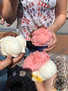 Unser Wasservorrat neigte sich bereits dem Ende (wir wollten unterwegs noch Nachschub kaufen) und aufgrund des frühen Startes des Roadtrips, hatten wir alle etwas Hunger. Bei der Hitze war aber kein Bedarf nach einer großen Mahlzeit, sondern eher nach was erfrischendem. Wie gut, dass Torben sich daran erinnern konnte, dass dies ihm und Patrick im letzten Jahr auch so erging. Damals hieß die Lösung: Eis!