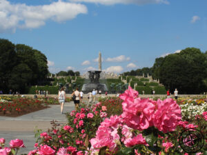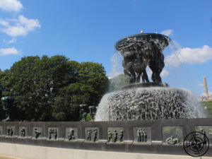 Für uns ging es nach einem kurzen Überblick auf einer Karte am Haupteingang dann einfach geradeaus bis zu der Skulpturenbrücke. Dort beginnt der Hauptteil der Skulpturen und insgesamt befinden sich 212 Stein- und Bronzeskulpturen im Park. Gustav Viegeland hatte diese von 1907-1942 (der Park entstand zwischen den Jahren 1923 und 1943) gefertigt und symbolisiert mit den Meisten den Kreislauf des menschlichen Lebens. Die Brücke beherbergt 58 Bronzeskulpturen und unter ihnen auch die bekannte „Sinnataggen„, ein zornig aufstampfendes Kleinkind. Die ganze Anlage bzw. auch die Anzahl der Skulpturen und Herrichtung mit den Blumen und dem Brunnen sah schon beeindruckend aus. Allerdings handelt es sich bei den Skulpturen überwiegend um Nacktdarstellungen und entsprach jetzt nicht ganz unserem Interesse.
