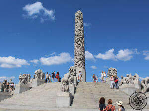 Über nachfolgende Treppen gelangt man dann, sofern man dem Weg weiter folgt, zu dem Monolitten. Die hier im Frognerpark 17 Meter hohe Säule aus einem einzigen Iddefjord-Granit. Dabei kann man in dieser Säule 121 Figuren erkennen, welche die Entwicklung vom Embryo über das Kleinkind und aller nachfolgender Lebensstadien des Menschen darstellt. Da die Skulpturen sehr detailiert aussehen, konnten wir uns auf dem ersten Blick nicht vorstellen, dass diese Figuren in den Stein gemeißelt wurden. Eine beeindruckende Arbeit! Um den Monolitten herum befinden sich noch 36 weitere Figurengruppen.