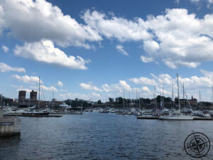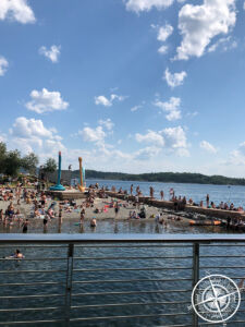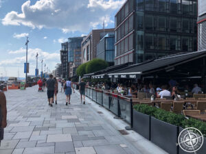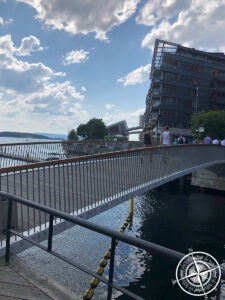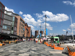 Viel hatten wir für den Tag nicht geplant gehabt und wollten eher spontan entscheiden. Daher ging es von der Metro Station „Majorstuen“ spontan in Richtung Hauptbahnhof. Vorher (am Vortag) kamen wir nur grob am Stadtteil oder Bezirk „Aker Brygge“ vorbei, doch Vivi hatte gelesen, dass sich ein Besuch dort lohnen soll. Somit nahmen wir uns dies als Nächstes vor. Vom Hauptbahnhof aus fuhren wir mit der Tram ein paar Stationen weiter direkt nach Aker Brygge. Dieser Stadtteil ist bekannt für seine Promenade und Gastronomien, welche sich mit Ausblick auf das Wasser an der Promenade entlang reihen. Zudem fahren die meisten Fähren von hier ganzjährig ab. Bei der Fahrt mit der Tram gab es ein kleines Highlight, denn vor uns stieg eine Familie mit einem kleinen Samojeden (Hunderasse) ein. Er wirkte noch recht tollpatschig und sein Herrchen hob ihn für die Fahrt lieber auf den Schoß. Dabei ließ er dann seine Vorderpfoten baumeln und schien die Fahrt trotz der Hitze zu genießen. Bei dem ganzen Fell könnte er bestimmt eine Abkühlung gebrauchen.