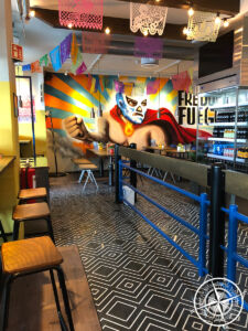 Wenn man dem Weg weiterhin folgt, gelangt man tatsächlich zu einem kleinen überschaubaren Strandbereich. Es handelte sich zwar eher um kleine Steine als um Sand, doch konnte man von dort aus auch in Wasser gehen. Darauf hielten wir kurz an einer Treppe an und schauten dem ganzen Trubel zu. Dabei waren echt viele im Wasser und vielleicht kommen wir auch nochmal in den Genuss. Doch aktuell verlangte es uns eher nach einer Mahlzeit, denn wir hatten Hunger. So gingen wir den Stadtteil Tjuvholmen wieder hinauf und schauten uns weiterhin um. Bei dem Mexikaner „Freddy Fuego“ sagten uns die Burritos zu und wir genossen draußen beim Essen den Blick auf den Fjord. Die Burritos waren sehr lecker und es erinnerte uns etwas an das „Chipotle“ aus der USA. Zur Auswahl standen 4 verschiedene Möglichkeiten (Rind, Schwein, Huhn und Vegetarisch), welche man danach individuell belegen lassen konnte.