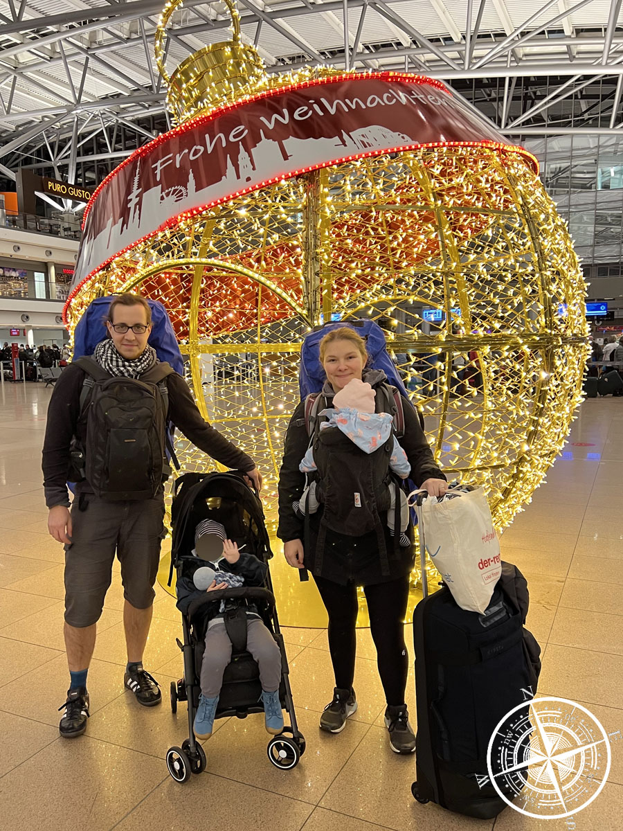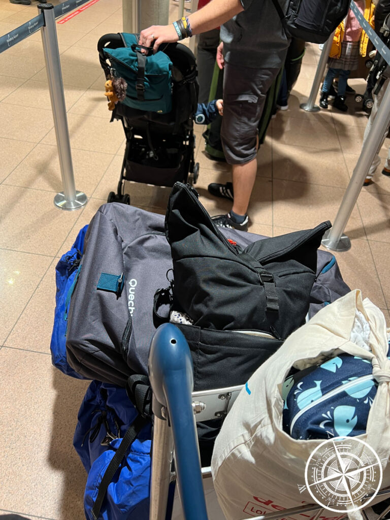 am Hamburger Flughafen. Noch ein letztes Foto und dann verabschiedeten wir uns von Torbens Onkel, der uns zum Flughafen gebracht hat und wir gingen weiter zum Check-In. Voll bepackt standen wir an und es dauerte auch so seine Zeit. Unsere Tochter (Malia) hatte ich (Vivi) in der Trage und auf dem Rücken die große Reisetasche. Ryan war im Buggy und da hatten wir noch seinen kleinen Handgepäcksrucksack, sowie einen Leinenbeutel mit Windeln und Snacks. Torben hatte seinen großen Rucksack, sowie Handgepäck und dann zogen wir noch die große Tasche der Kids mit. Ryan hatte natürlich keine Lust so lange im Buggy zu sitzen und Vivi war die Last mit dem großen Rucksack auch recht schwer, so organisierte Torben kurzerhand einen Gepäckwagen, der da so rumstand und wir konnten hier erstmal gebündelt unsere Sachen abladen und der Große konnte sich ein bisschen bewegen – soweit man das eben da in der Schlange kann.