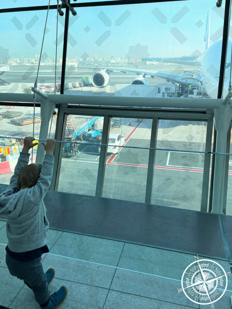 In Dubai haben wir uns dann erstmal einen Platz gesucht und durch die kostenfreien Buggys am Flughafen konnte auch Ryan etwas sitzen und geschoben werden. Dank freiem WLAN konnte der Große seine geliebte Serie schauen und Vivi organisierte Kaffee. Wir hatten dort 2 ½ Stunden Aufenthalt und als unser Gate bekannt war, sind wir dann dort hin. Es dauerte dann noch ein wenig bis zum Boarding und ist immer einer von uns mit dem Großen los für ein bisschen Bewegung. Das hat soweit ganz gut geklappt und die Kinder konnten wir dort auch ordentlich wickeln. Im Flugzeug gibt es ja nur einen sehr kleinen Wickeltisch. Der Große scheint uns dafür schon zu groß und zu schwer und wir mussten ihn zum Glück bisher nicht on Board wickeln. Mit der Kleinen ging das noch ganz gut.