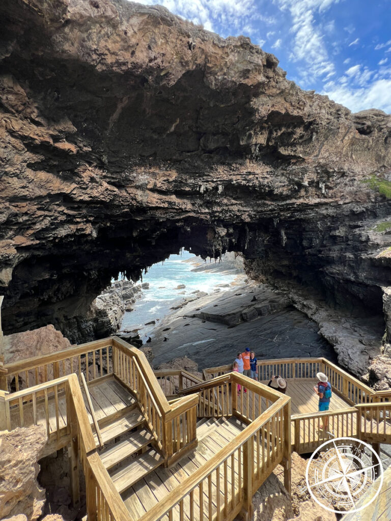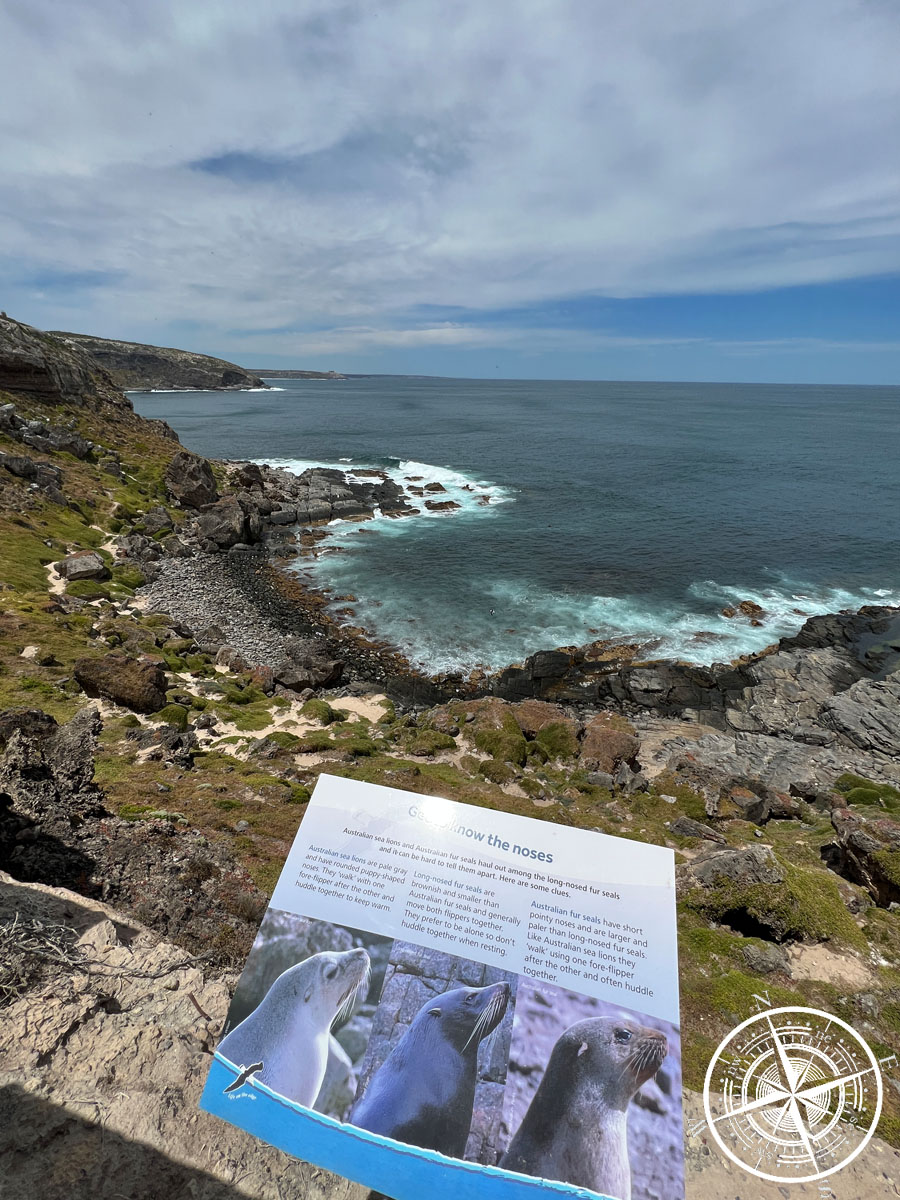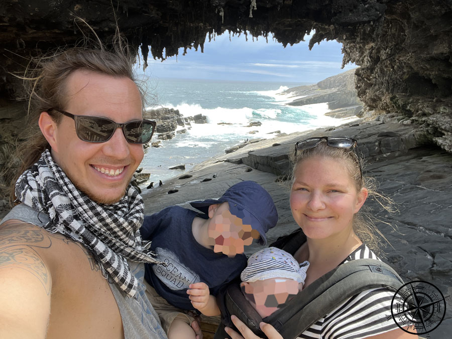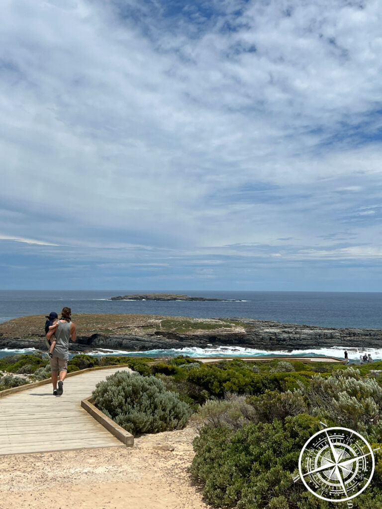 Dort kann man auch direkt parken und zu Fuß weiter zum „Admirals Arch Boardwalk“ gehen. Ein toller Holzpfad mit schöner Aussicht auf das Meer und die Felsen. Wir sind dann den Weg komplett entlanggegangen und am Ende ist man dann bei der Höhle angekommen. Hier tummelten sich einige Seelöwen. Das fand der Große besonders schön anzusehen. Manche ruhten sich aus, andere plantschten im Wasser oder spielten/kämpften miteinander.