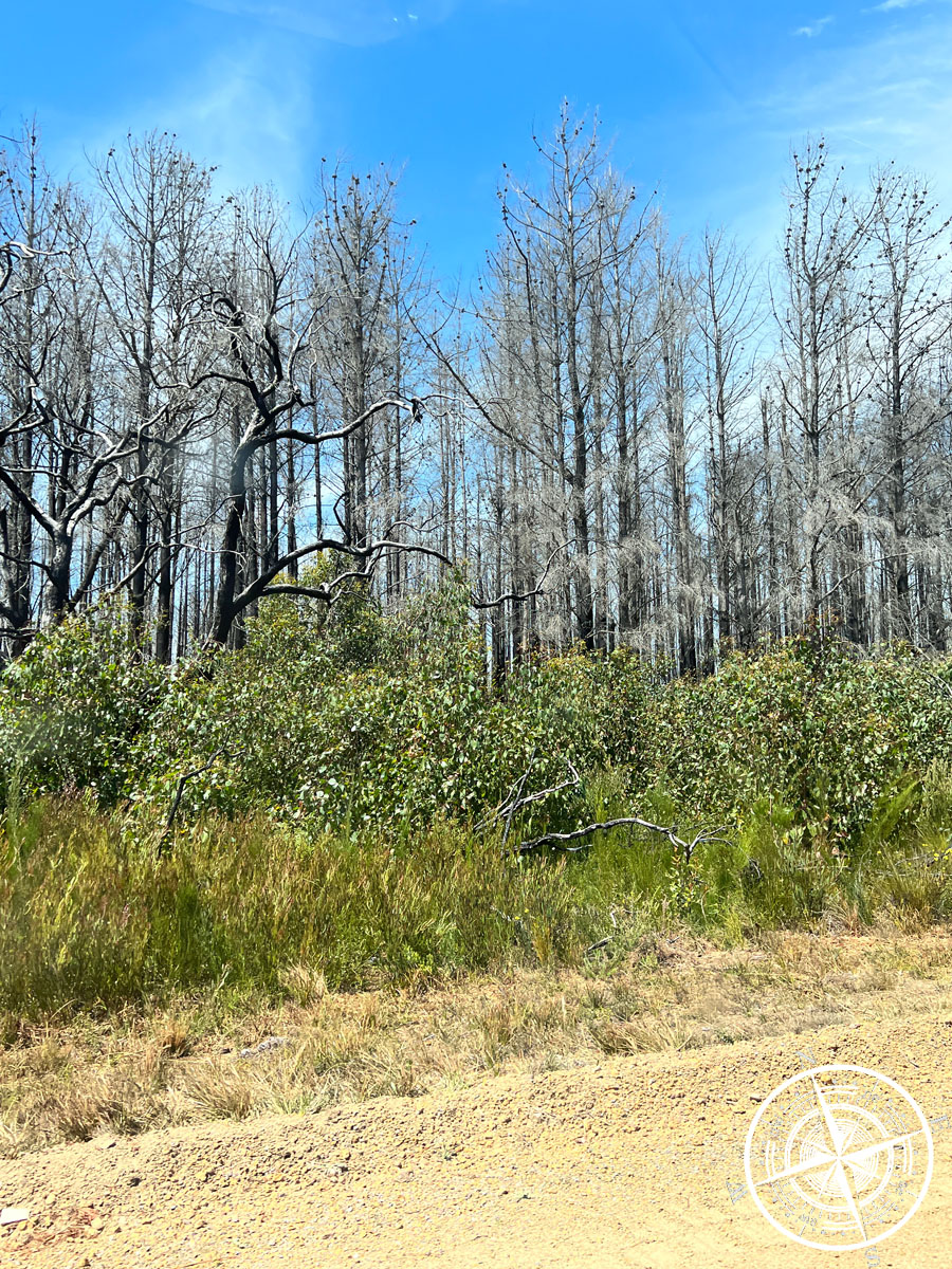 Die Seelöwen waren schon toll, aber so richtig befriedigend war es für keinen von uns. Wir verließen den Nationalpark, aber fuhren dann erstmal über den „W End Hwy“ in Richtung Norden. Hier konnte man auch noch sehr gut die Ausmaße des Feuers sehen bzw. auch von aktuelleren Bränden, denn hier waren noch viele Bäume ziemlich kahl und schwarz.
