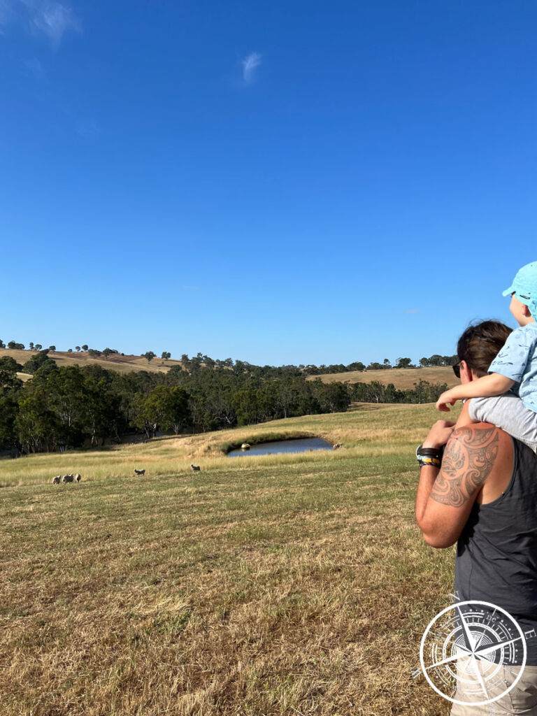 Nachdem wir uns eingerichtet hatten, haben wir uns ein wenig auf dem Gelände umgesehen. Die Schafe waren schon ein absolutes Highlight für den Großen. Zudem haben Cherryl und Geoff noch zwei Hunde und drei Hühner.