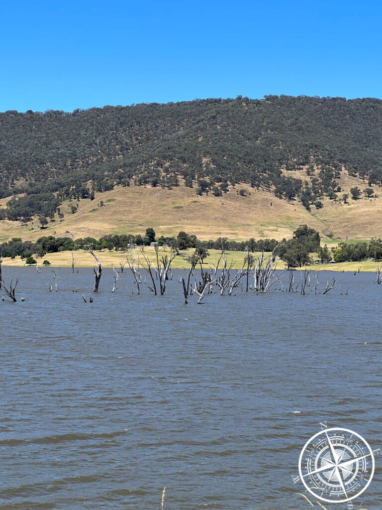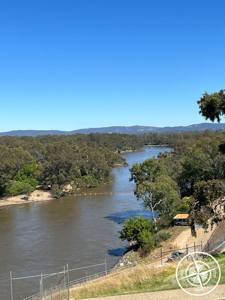 Wir sind also vom „Hume Dam“ zur „Bethanga Bridge“ gefahren. Kurz danach ist die Staatsgrenze und man fährt somit von „New South Wales“ nach „Victoria“. Wir sind der „Lake Road“ gefolgt, die weitestgehend direkt am Fluss entlangführt. Irgendwann war die Straße dann auch nicht mehr geteert, aber der Ausblick wurde immer schöner! 😊