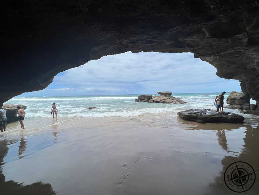 Die Kinder sind während der Fahrt eingeschlafen, sodass wir uns vor Ort nur mit einem kurzen jeweiligen Ausstieg aufhielten. Der bekannte Fotostop ist über einen kurzen Weg vom Strand zu erreichen. Einmal kurz durchs Wasser und schon steht man in einer Höhle. Hier folgt dann ein Tunnelweg auf die andere Seite, wo man weitere Klippen und Steinformationen im Wasser bestaunen kann. Torben hatte das alles mit der GoPro aufgenommen und ihr könnte das im VLOG anschauen. 🙂