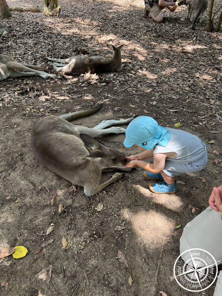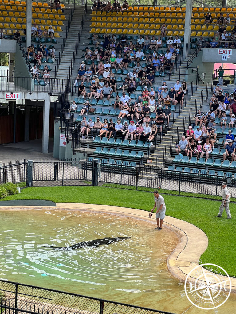 Es folgte dann ein Rundgang zu den Kängurus, die man auch wieder füttern durfte und anschließend ging es durch die „Wetlands“. Hier waren vor allem Emus und andere Wasservögel zu bestaunen. Dann nahmen wir eine Abkürzung zurück zum „Crocoseum“, um bei der kostenfreien Veranstaltung zur Mittagszeit teilzunehmen. R. hatte seit den „Wetlands“ einen Mittagsschlaf im Buggy gestartet und während Vivi einen Platz suchte, wartete Torben bis zum Start der Veranstaltung um R. dann aus dem Buggy rauszunehmen. Leicht verschlafen ging es dann los. Nach einer Eröffnungsrede wurden einige Vögel und Reptilien vorgestellt, bevor es dann zur Hauptattraktion kam, dem Krokodil. Beeindruckend war hier die Darstellung der Beißkraft, die mit zu den Stärksten der Welt gehört.
