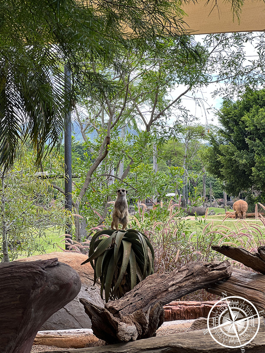 Anschließend stärkten wir uns im Gastronomiebereich und setzten dann unsere Erkundung fort. Wir nahmen einen Shuttle, um zum Afrika-Bereich zu gelangen. Hier gab es neben Giraffen, Nashörnern und Zebras auch Erdmännchen. Die fand R. besonders lustig. Wir waren viel zu Fuß unterwegs und auf dem Rückweg bestaunten wir noch die Lemuren auf „Bindys Island“, sowie Tiger und Elefanten. Auch einem Wombat sind wir wieder bei seinem Nachmittagsspaziergang begegnet. Es bahnte sich in der Ferne so langsam dunkle Wolken an und ein Gewitter war bereits zu hören. Daher steuerten wir als Letztes noch die „Red Kangaroos“ an, bevor wir uns wieder auf den Rückweg zum Auto machten.