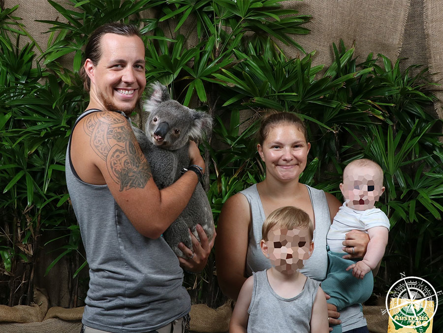 Dann war Zeit für unser Koala Familienfoto. Zunächst standen wir an der falschen Stelle an, doch Vivi hatte ein Hinweis entdeckt. Am richtigen Ort mussten wir noch kurz warten, bis wir dann dran waren. Torben hielt den Koala, während R. auf einem Podest stehen durfte und M. war bei Vivi auf dem Arm. Für uns ein toller Moment und eine schöne Erinnerung! Als kleines Highlight durfte sich R. einen Plüschkoala aussuchen. So ein Koala Kuscheltier ist ja schließlich auch niedlich.
