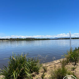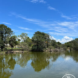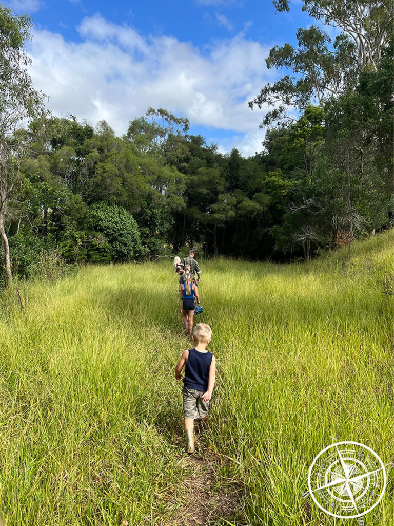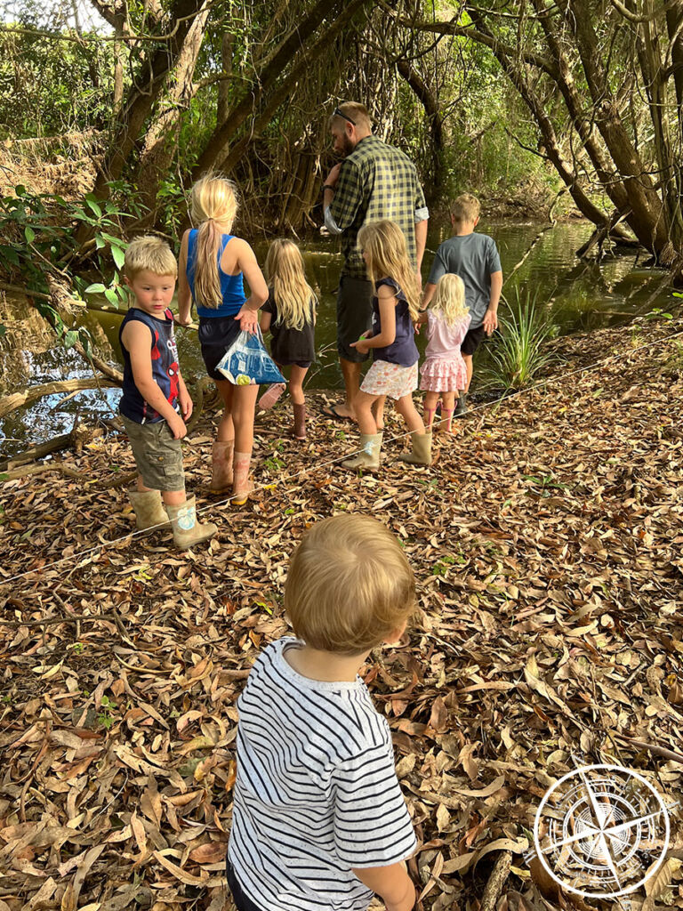 Der Vater der Familie (Lachlan) fragte, ob wir runter zum Fluss (Creek) wollten. Der lag direkt am Grundstück und wird gelegentlich auch zum plantschen genutzt. Torben und R. schließen sich an und so ging es mit allen Kindern und beiden Vätern los. Erstmal durch das hohe Gras vorbei am Zaun. Dann kurz testen ob der Elektrozaun noch aktiv ist und schließlich darunter durch. An der eigentlichen Stelle bei einer Brücke war das Gras aber noch höher und musste erstmal gekürzt werden. Daher gingen wir dann zu einem anderen Platz, wo die Kinder abwechselnd Steine und Stöcker ins Wasser warfen.