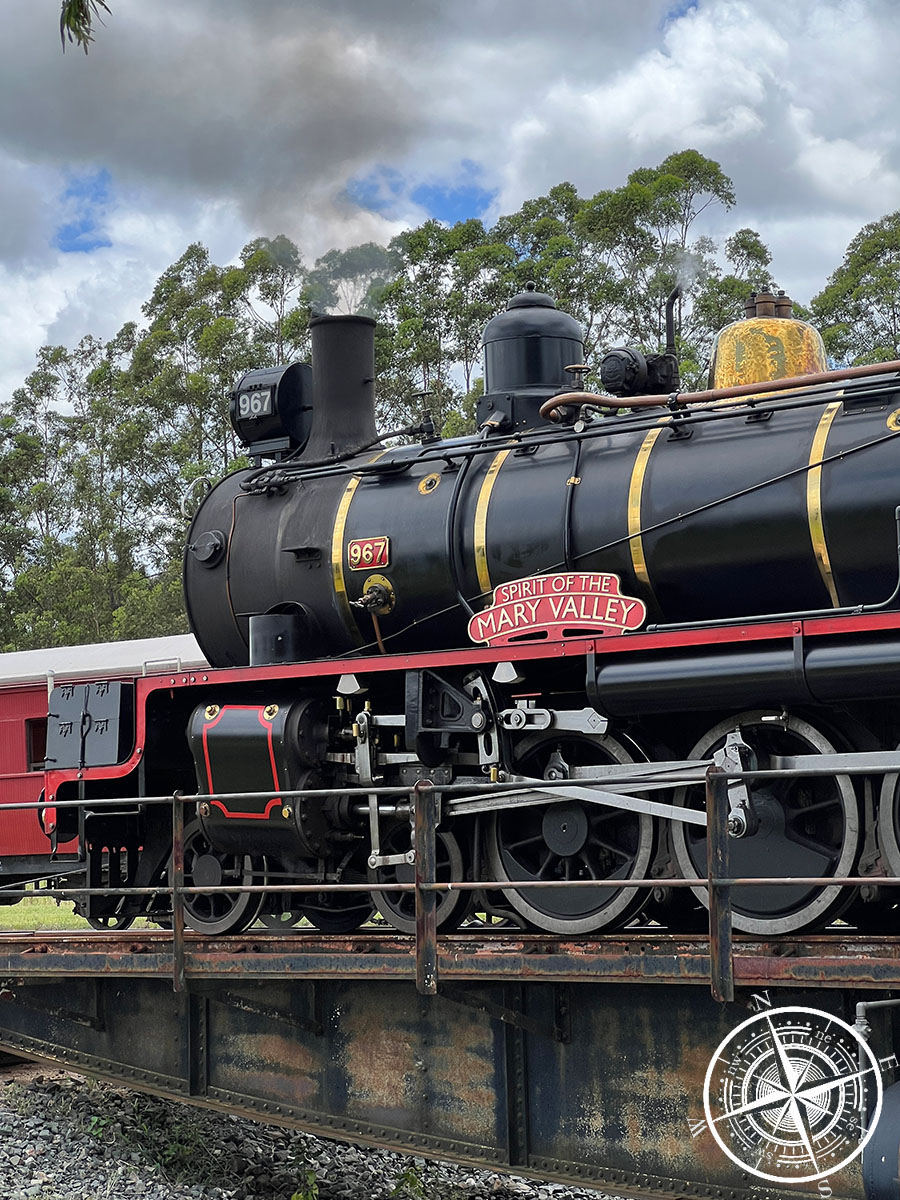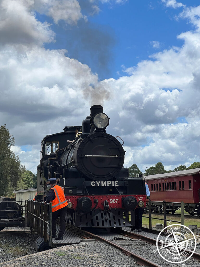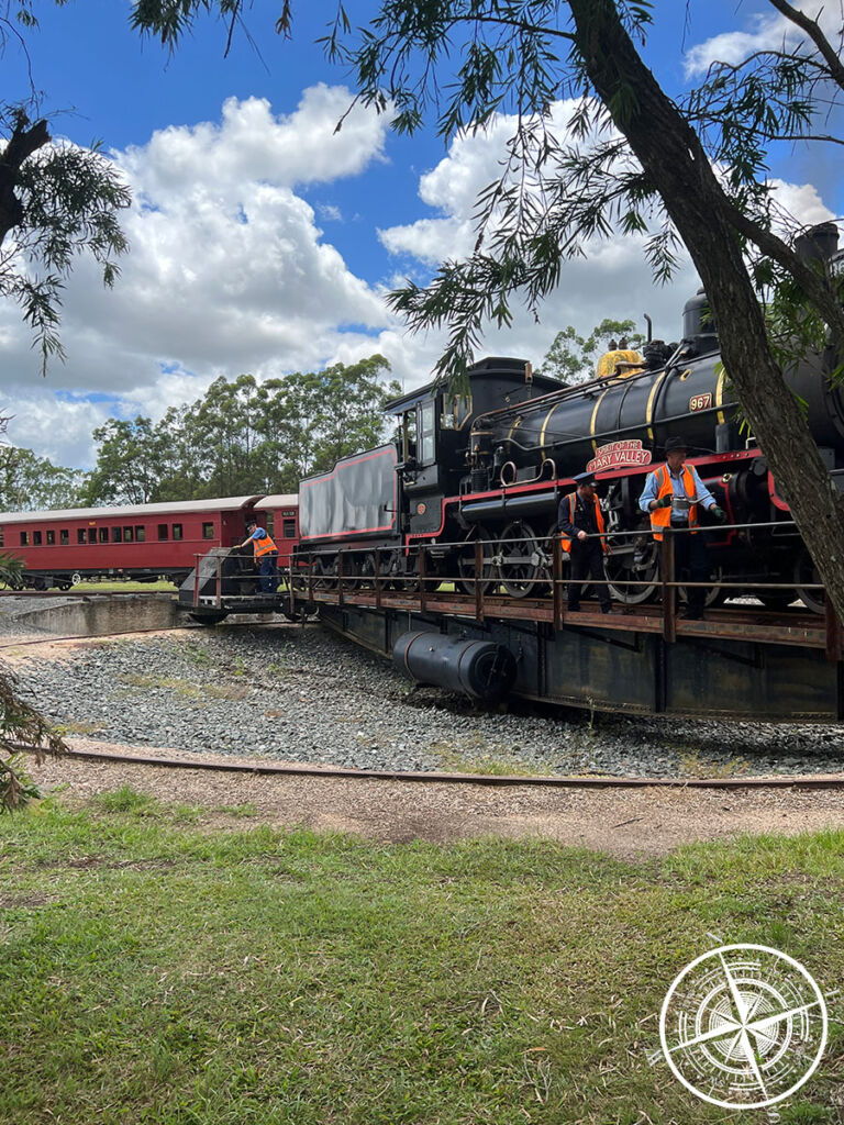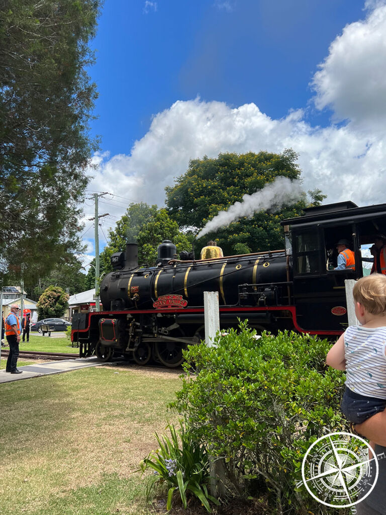 Doch bevor wir zum Lunch starteten, hatte Anna noch eine Idee. Ganz in der Nähe von deren Zuhause fährt eine alte Dampflok von Gympie bis zu einer Endhaltestelle in „Amamoor“. So fuhren wir (wir in unserem Auto und unsere Gastgeberfamilie in ihrem) dort zuerst hin. Da Anna die passende Zeit rausgesucht hatte, kamen wir genau pünktlich an. Die Fahrt dorthin dauerte nur ca. 10 Minuten. Man kann sich für die Zugfahrt mit der Dampflok Tickets kaufen und quasi eine Sightseeing Fahrt inkl. Snack machen. Laut Vivis Recherche aber viel zu teuer!