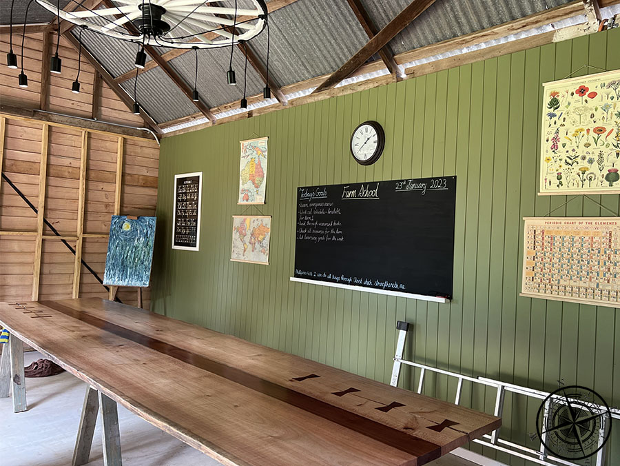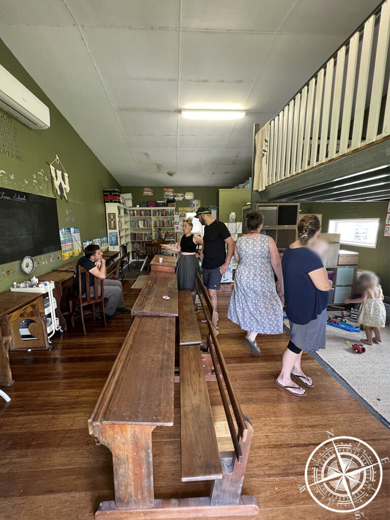 Es gibt eine Vielzahl von neuen Schaukeln am großen Baum und die Scheune, wo wir damals übernachtet hatten, wurde zu einem Schulbereich umgebaut. Kristy ist nämlich Lehrerin und unterrichtet Kinder, die sonst im Homeschooling sind und hier an einzelnen Tagen mit anderen Kindern lernen können. Hier gibt es nun ein richtiges Klassenzimmer mit Spielzeug und einer riesigen Auswahl an Büchern.