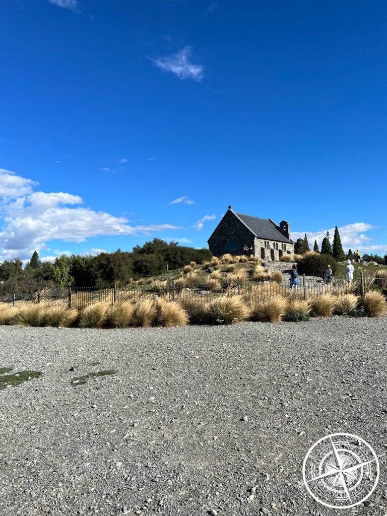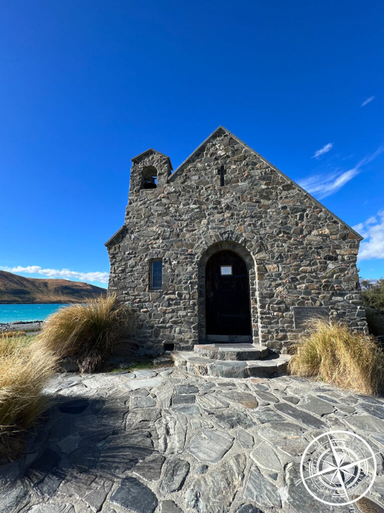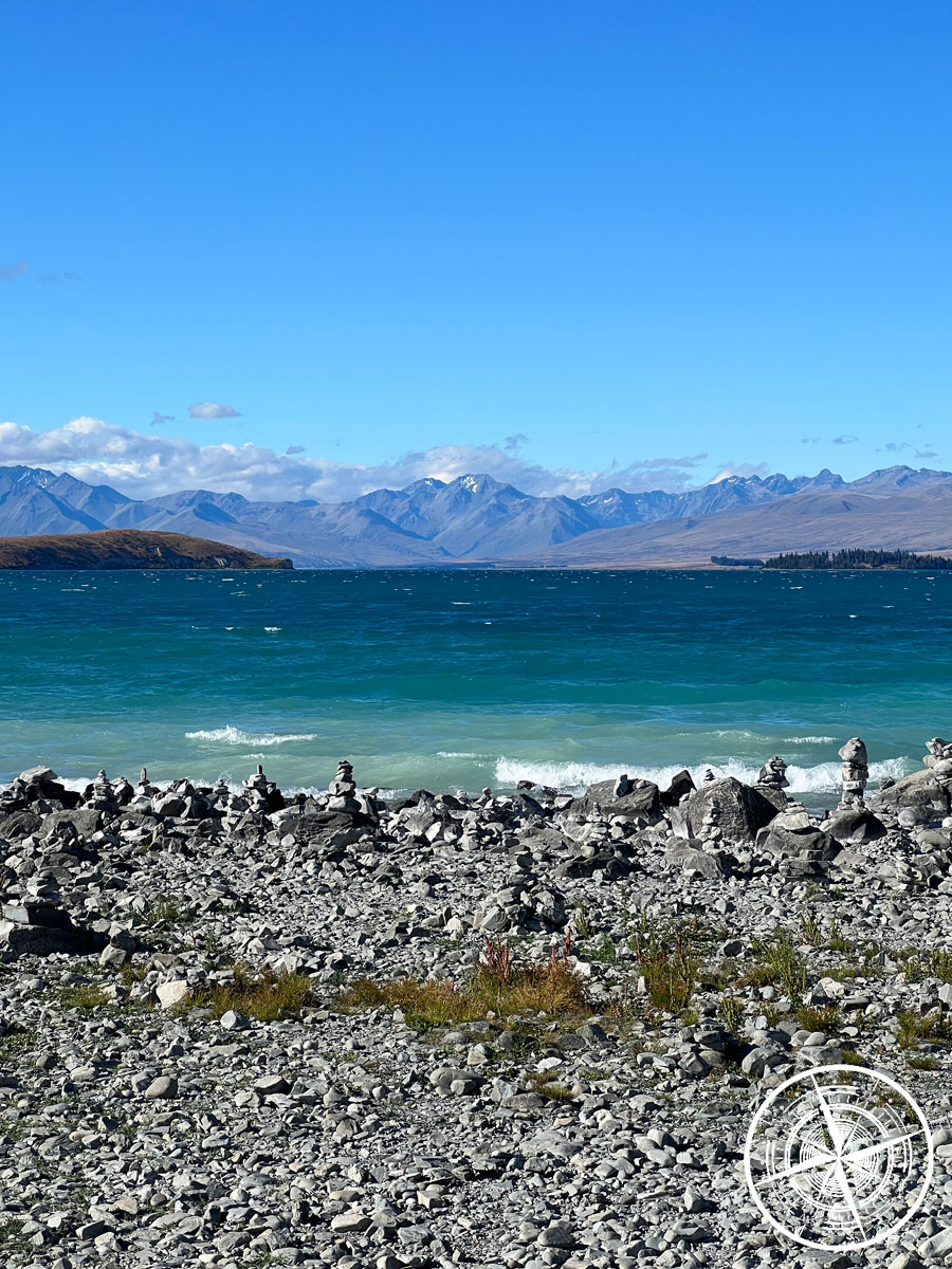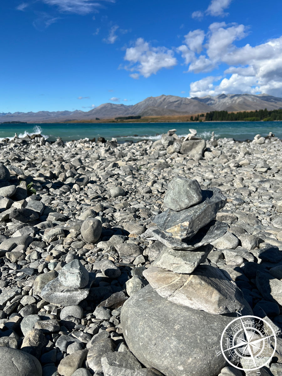 Die Farben des „Lake Tekapo“ sind schon sehr beeindruckend und wir machten viele Fotos. Bei der Kirche war dann auch etwas mehr los, da dies ein sehr bekannter Fotostop ist. Bei der Kirche kann man dann auch direkt noch runter bis ans Wasser, wo viele Steine gestapelt sind. Wir haben es dann natürlich auch noch mit einem eigenen Steinturm ergänzt. 😊